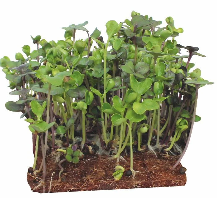 В набор семян для микрозелени капусты листовой Кале входят ранние сорта. От всходов до хозяйственной годности в фазе семядольных листьев 6-7 дней. Семядольные листья зелёные, гофрированные. Окраска черешков двух сортов смеси салатовая и фиолетовая. Вкус зелени освежающий, пикантный с лёгкой горчинкой. В её составе много белка, все незаменимые аминокислоты, витамины А, С, группы В, К и РР, кальций, магний, микроэлементы, а также сульфорафан, обладающим антиканцерогенным и антибактериальным эффектом и другими полезными свойствами. Одна из лучших культур для диетического питания. Семена тёмно-коричневые. С площадки 11х8 см можно получить от 15 до 20 граммов витаминной микрозелени.В набор входят семена, коврик, лоток.