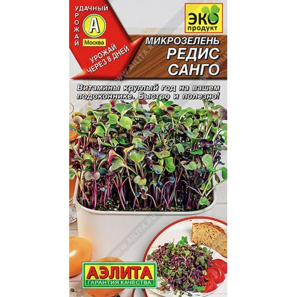 Уникальный листовой сорт редиса с фиолетовой окраской и ярким насыщенным вкусом. Не образует корнеплодов. Нежная сочная зелень является бесценным источником витаминов и украсит любое блюдо. Стимулирует иммунитет, придает организму бодрости и сил. Очень полезна для профилактики диабета и подагры. Способствует быстрому насыщению пищей и помогает нормализовать вес. Cостав: Редис Санго. В качестве субстрата для выращивания используют питательный грунт. Семена равномерно распределяют по уплотненной поверхности без присыпания. Грунт и семена проливают раствором перекиси водорода (6 мл на 1 л воды). Накрывают для сохранения увлажнения. Посевы проводят круглогодично.