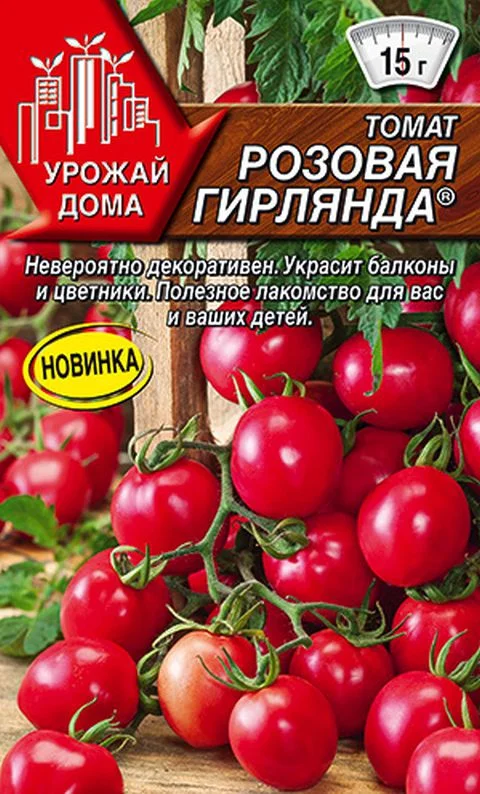 Великолепный сорт для домашнего садоводства. Идеально подходит для выращивания на балконе, лоджиях, в вазонах и кашпо.Томат, который полностью оправдывает свое название – кисти, действительно, похожи на гирлянду. Сорт детерминантный,  очень  ранний, первыми плодами уже можно полакомиться спустя всего 90-95 дней.Плоды привлекательного розового цвета массой 10-15 г, которые непременно хочется попробовать.Очень сладкие, с небольшой кислинкой, что придает им пикантности. Отлично подходит для детского и диетического питания, приготовления и украшения салатов, идеален для консервирования, в том числе цельноплодного и ассорти. Урожайность – 4,0-4,2 кг/м 2.Растения не нуждаются в подвязке и пасынковании. Сорт можно выращивать в открытом грунте и теплицах в качестве уплотнителя высокорослых томатов. Сорт имеет хороший иммунитет к болезням томата. В комнатных условиях плодоносит даже в зимнее время (с подсветкой).