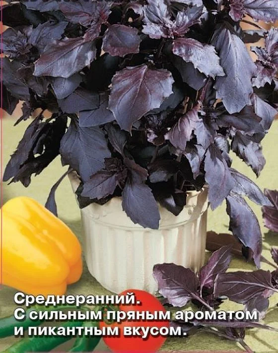 Среднеранний сорт для выращивания в открытом и защищенном грунте, на балконах и лоджиях. Растение полураскидистое, хорошо облиственное, высотой 40-45 см. Листья темно-фиолетовые, с сильным пряным ароматом и пикантным пряно-островатым вкусом. Масса растений 180-200 г. Требователен к теплу и свету, высаживается на защищенных от холодных ветров и хорошо освещенных солнцем местах. Влаголюбив и отзывчив к азотным удобрениям, увеличивающим урожай зеленой массы. Для лучшей кустистости растения прищипывают. Ценность сорта: сильная ароматичность, которая сохраняется в сухих растениях до 3 лет, высокий любительский спрос. Используется в свежем виде в качестве пряно-вкусовой добавки к овощам, мясным блюдам, маринадам, в сушеном – для специй. Применяют как лечебное и профилактическое средство при заболеваниях почек и желчного пузыря.