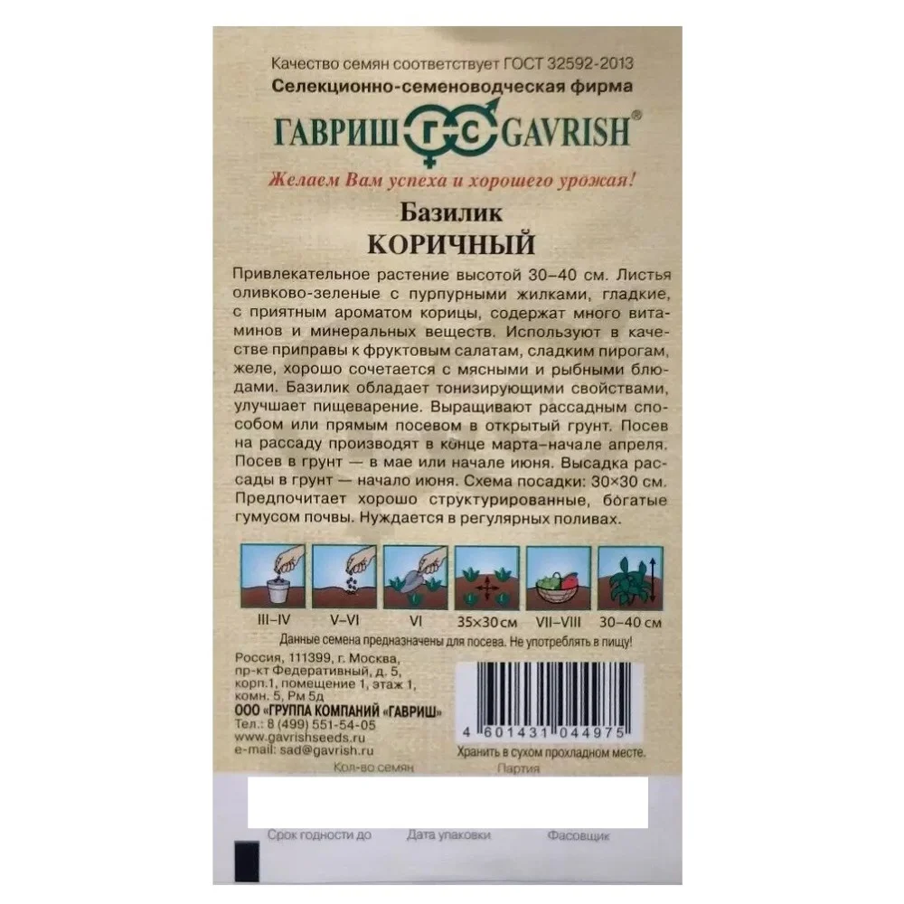 Привлекательное растение высотой 30-40 см. Листья оливково-зеленые с пурпурными жилками, гладкие, с приятным ароматом корицы, содержат много витаминов и минеральных веществ. Используют в качестве приправы к фруктовым салатам, сладким пирогам, желе, хорошо сочетается с мясными и рыбными блюдами. Базилик обладает тонизирующими свойствами, улучшает пищеварение. Выращивают рассадным способом или прямым посевом в открытый грунт. Посев на рассаду производят в конце марта – начале апреля. Посев в грунт в мае или начале июня. Высадка рассады в грунт – начало июня. Схема посадки 30x30 см. Предпочитает хорошо структурированные, богатые гумусом почвы. Нуждается в регулярных поливах.