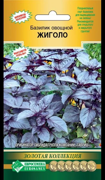 Используется в свежем виде как салатная зелень и пряно-вкусовая добавка в домашней кулинарии и при консервировании. Базилик улучшает пищеварение, возбуждает аппетит, обладает противовоспалительным действием, широко применяется в медицине при простудных заболеваниях верхних дыхательных путей. «Жиголо»- позднеспелый сорт базилика, рекомендованного для выращивания на зелень, как в открытом, так и в закрытом грунте. От полных всходов до уборки на зелень 47-50 дней, до цветения-65-72 дня.