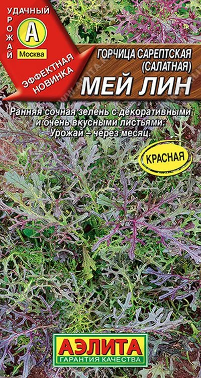 Раннеспелый сорт необычайно красивой и полезной салатной зелени, придает оригинальный терпкий вкус привычной еде. Горчицу быстро и легко вырастит даже начинающий овощевод. Срезка урожая проводится уже через 25-30 дней после всходов. Розетка приподнятая, ? 25-30 см, листья очень сочные. Благодаря неповторимой декоративности сорт может найти неожиданное применение в украшении цветника. Интенсивность проявления антоциановой окраски зависит от степени освещенности посадок.