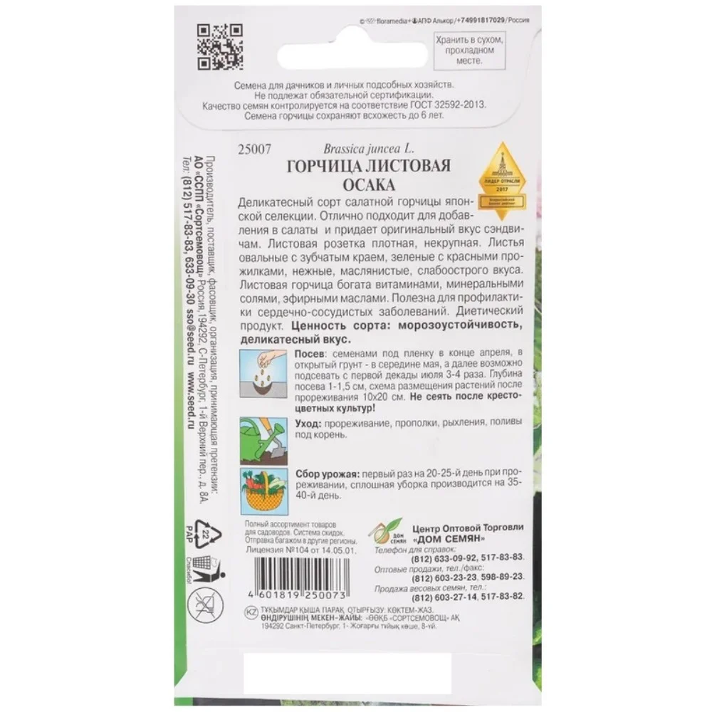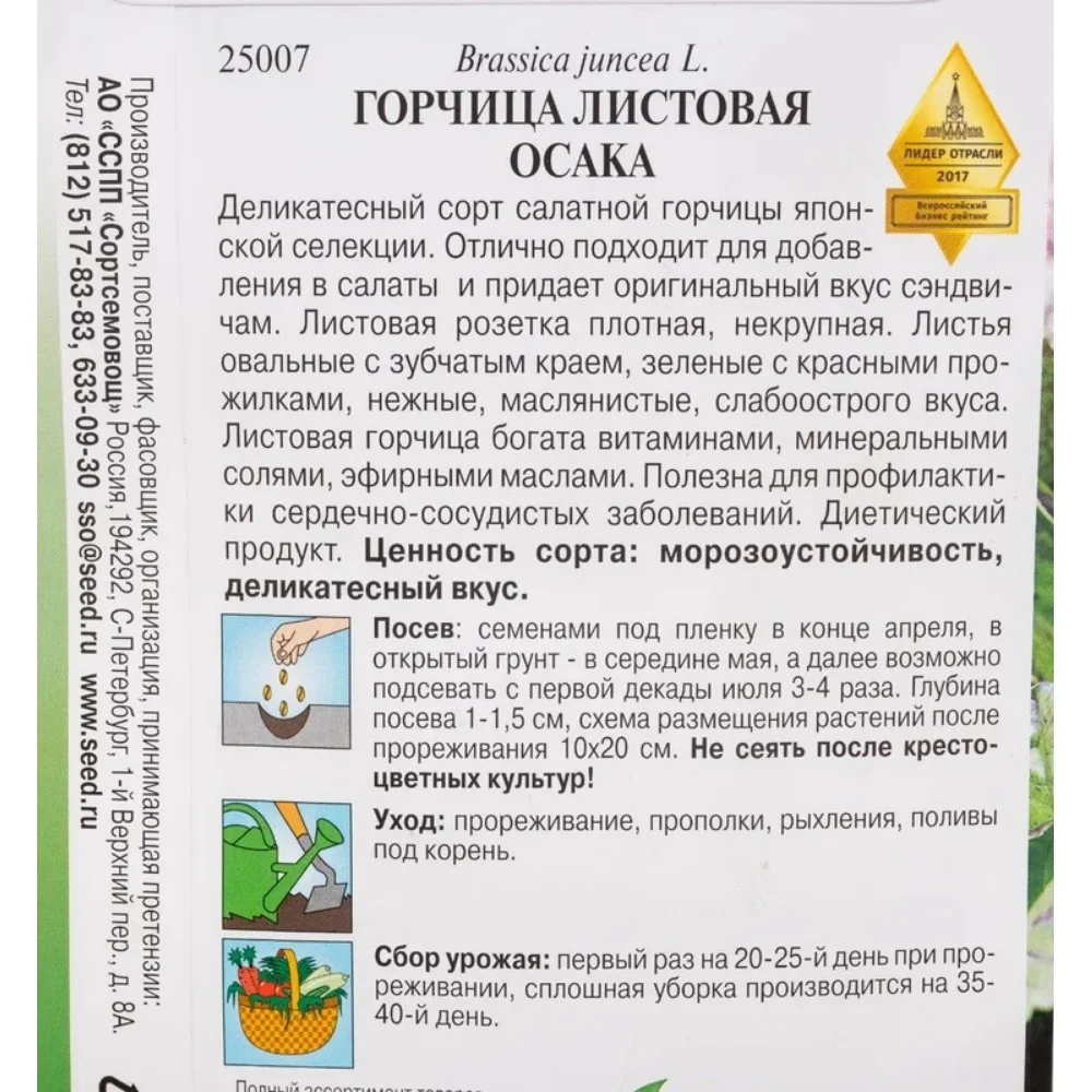 Деликатесный сорт салатной горчицы японской селекции. Отлично подходит для добавления в салаты  и придает оригинальный вкус сэндвичам. Листовая розетка плотная, некрупная. Листья  овальные с зубчатым краем, зеленые с красными прожилками, нежные, маслянистые, слабоострого вкуса.  Листовая горчица богата витаминами, минеральными солями, эфирными маслами. Полезна для профилактики сердечно-сосудистых заболеваний. Диетический продукт. Ценность сорта: морозоустойчивость, деликатесный вкус. Посев: семенами под пленку в конце апреля, в открытый грунт - в середине мая, а далее возможно подсевать с первой декады июля 3-4 раза. Глубина посева 1-1,5 см, схема размещения растений после прореживания 10х20 см. Не сеять после крестоцветных культур!Уход: прореживание, прополки, рыхления, поливы под корень.Сбор урожая:первый раз на 20-25-й день при прореживании, сплошная уборка производится на 35-40-й день.