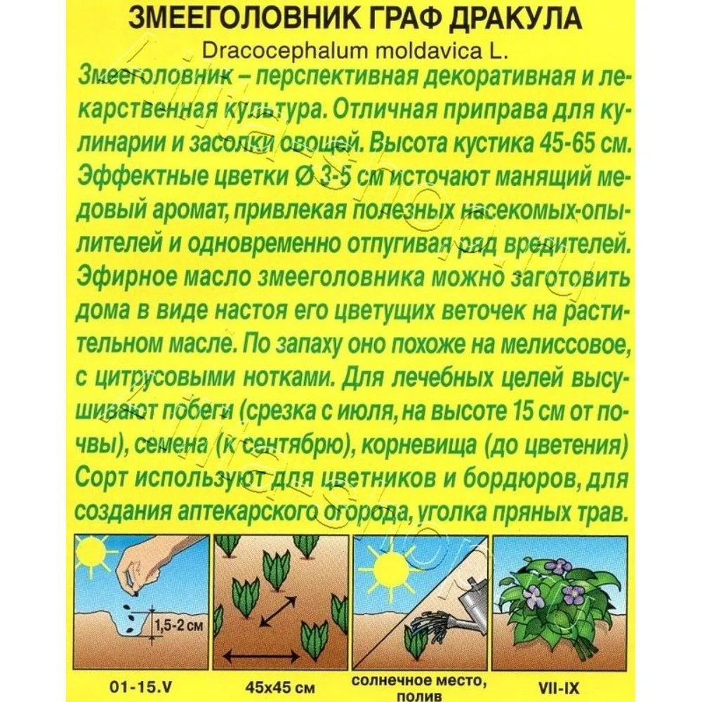 Змееголовник – перспективная декоративная и лекарственная культура. Отличная приправа для кулинарии и засолки овощей. Высота кустика 45-65 см. Эффектные цветки 3-5 см источают манящий медовый аромат, привлекая полезных насекомых-опылителей и одно временно отпугивая ряд вредителей. Эфирное масло змееголовника можно заготовить дома в виде настоя его цветущих веточек на растительном масле. По запаху оно похоже на мелиссовое, с цитрусовыми нотками. Для лечебных целей высушивают побеги (срезка с июля, на высоте 15 см от почвы), семена (к сентябрю), корневища (до цветения). Сорт используют для цветников и бордюров, для создания аптекарского огорода, уголка пряных трав.