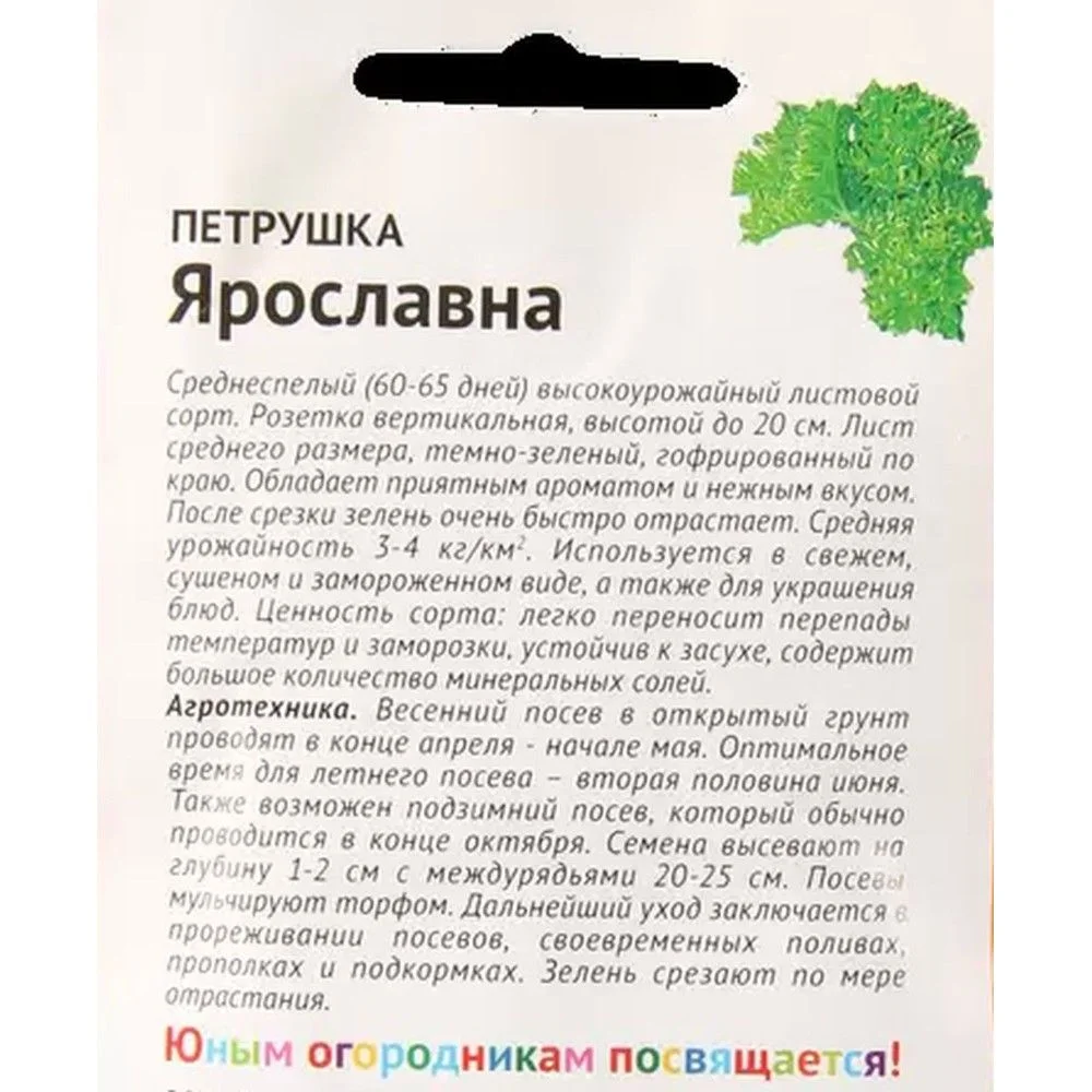 Среднеспелый урожайный сорт. Период от появления всходов до начала срезки на зелень составляет 60-65 дней. Листовая розетка вертикальная, высотой до 20 см. Листья среднего размера, тёмно-зеленые, гофрированные по краю. Средняя урожайность 3-4 кг/км2. Ценность сорта: неприхотливость, устойчивость к перепадам температуры и кратковременным заморозкам, быстрое отрастание листьев после срезки, приятный аромат и нежный вкус зелени, высокое содержание витаминов и минеральных солей. Употребляется в пищу в свежем, сушёном и замороженном виде. Прекрасно подходит для украшения блюд. Агротехника. Петрушка предпочитает лёгкие, плодородные, хорошо окультуренные почвы. Весенний посев семян в открытый грунт проводят в конце апреля-начале мая. Оптимальным временем для летнего посева является вторая половина июня. Также возможен подзимний посев, который обычно проводится в конце октября. Семена высевают на глубину 1-2 см рядовым способом с междурядьями 20-25 см. После посева поверхность почвы мульчируют торфом. Дальнейший уход заключается в прореживании всходов, своевременных поливах, подкормках и прополках. Зелень срезают по мере отрастания.