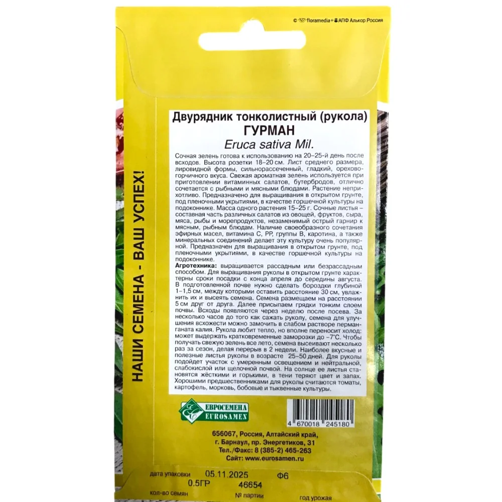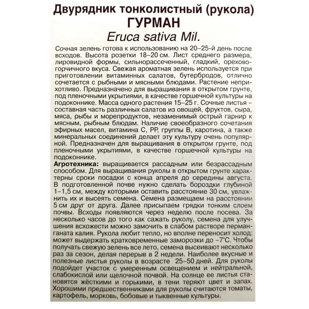 Сочная зелень готова к использованию на 20-25-й день после всходов.Высота розетки 18-20 см.Лист среднего размера, лировидной формы, сильно-рассеченный, гладкий, орехово-горчичного вкуса.