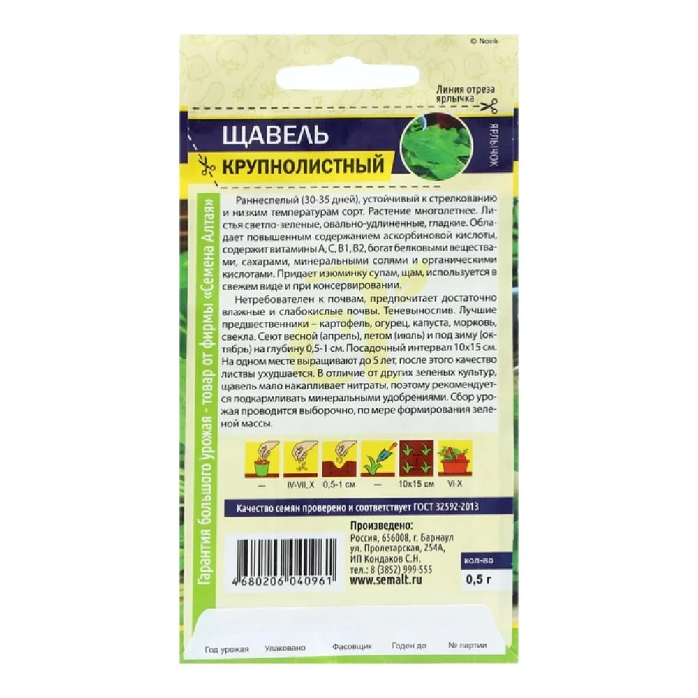 Раннеспелый (30-35 дней), устойчивый к стрелкованию и низким температурам сорт.Растение многолетнее. Листья светло-зеленые, овально-удлиненные, гладкие. Обладают повышенным содержанием аскорбиновой кислоты, содержит витамины A, C, B1, B2? богат белковыми веществами, сахарами, минеральными солями и органическими кислотами. Придает изюминку супам, щам, используется в свежем виде и при консервировании.