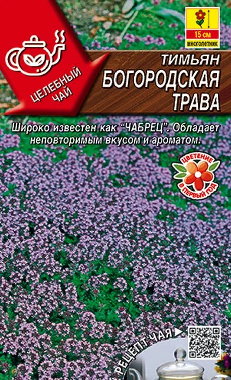 Неприхотливый многолетник, одинаково популярный в кулинарии, медицине и садоводстве. Широко известен как чабрец. Кустики высотой 10-15 см, со стелющимися тонкими стеблями. Они быстро разрастаются, заполняя вокруг себя всё свободное пространство. Отличный медонос. Все части растения имеют неповторимый, очень приятный терпкий аромат, и подходят для заготовки сырья. Используют тимьян в свежем и сушеном виде. Собирать зелень можно с мая по октябрь. Чай с чабрецом – один из самых любимых напитков во всем мире.Посев поверхностный, с мульчированием семян песком. Посадки размещают на солнечных участках с легкой почвой нейтральной кислотности, чистой от сорняков. Тимьян не выносит переувлажнения – почва должна быть хорошо дренированной. Возможен прямой посев семян в открытый грунт.