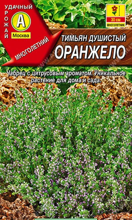 Очень редкий сорт тимьяна с неповторимым апельсиново-пряным ароматом. Растение многолетнее, широко известно так же как чабрец. Формирует сильноветвистые кустики высотой около 30 см, разрастающиеся в ширину. Молодые побеги с листьями периодически срезают и сушат. Их используют в кулинарии в качестве приправы, а также для приготовления полезного и вкусного чая. Тимьян прекрасно развивается в различных контейнерах на балконе или террасе. В саду можно выращивать вдоль дорожек и на каменистых горках. Отличный медонос, привлекает пчел и шмелей.Тимьян предпочитает солнечные участки, защищенные от ветра, с хорошо дренированными, некислыми почвами легкого мехсостава. Массовую срезку зелени проводят в начале цветения. Возможен посев непосредственно в открытый грунт рано весной или под зиму. Глубина заделки семян не более 0,5 см.