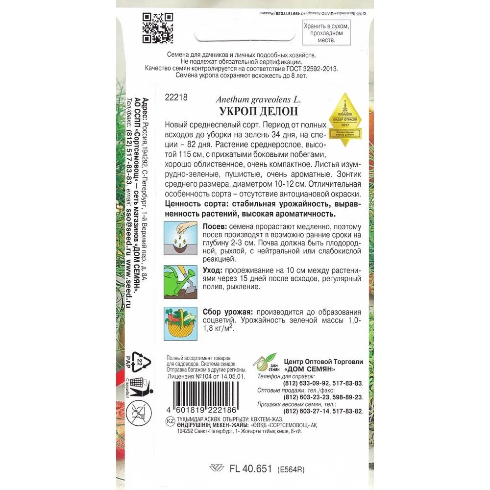 Укроп кустовой и сильнооблиственный.Среднеранний сорт, на зелень - 35-50 дней от всходов, на специи - 80-82 дня. Высота растения 100 см. Хорошо облиственное. На зелень.