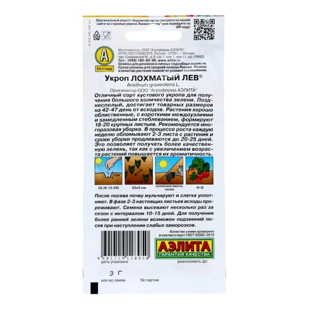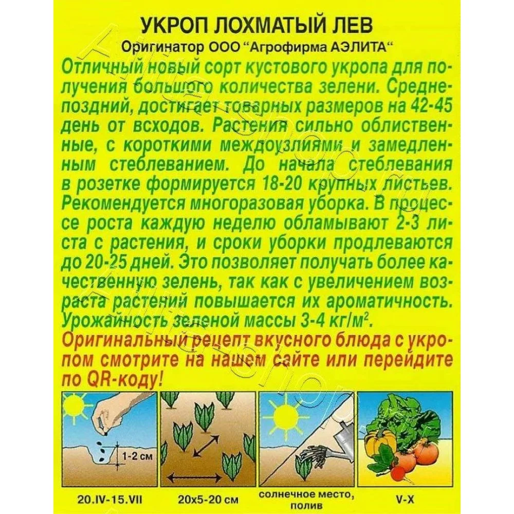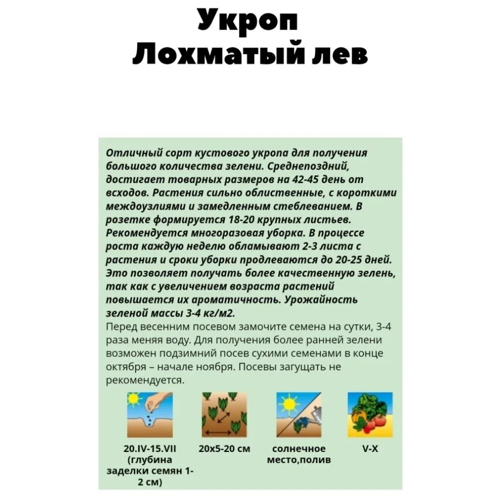 Отличный новый сорт кустового укропа для получения большого количества зелени. Среднепоздний, достигает товарных размеров на 42-45 день от всходов. Растения сильно облиственные, с короткими междоузлиями и замедленным стеблеванием. До начала стеблевания в розетке формируется 18-20 крупных листьев. Рекомендуется многоразовая уборка. В процессе роста каждую неделю обламывают 2-3 листа с растения. Благодаря этому сроки уборки продлеваются до 20-25 дней. Большая продолжительность уборки дает возможность получать более качественную зелень, так как с увеличением возраста растений возрастает их ароматичность. Урожайность зеленой массы 3-4 кг/м 2 .