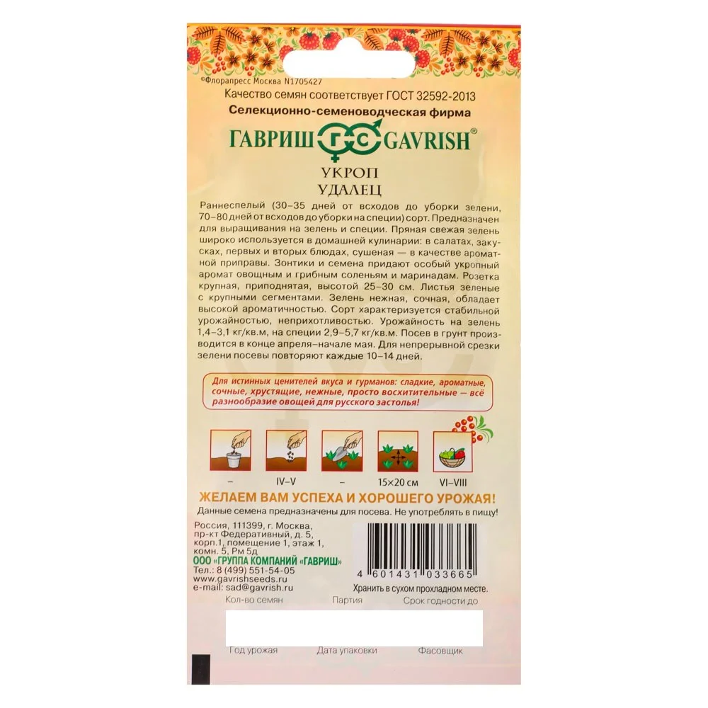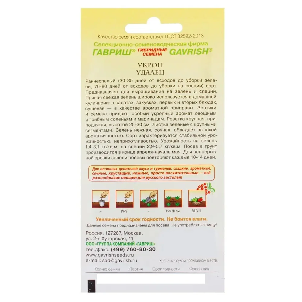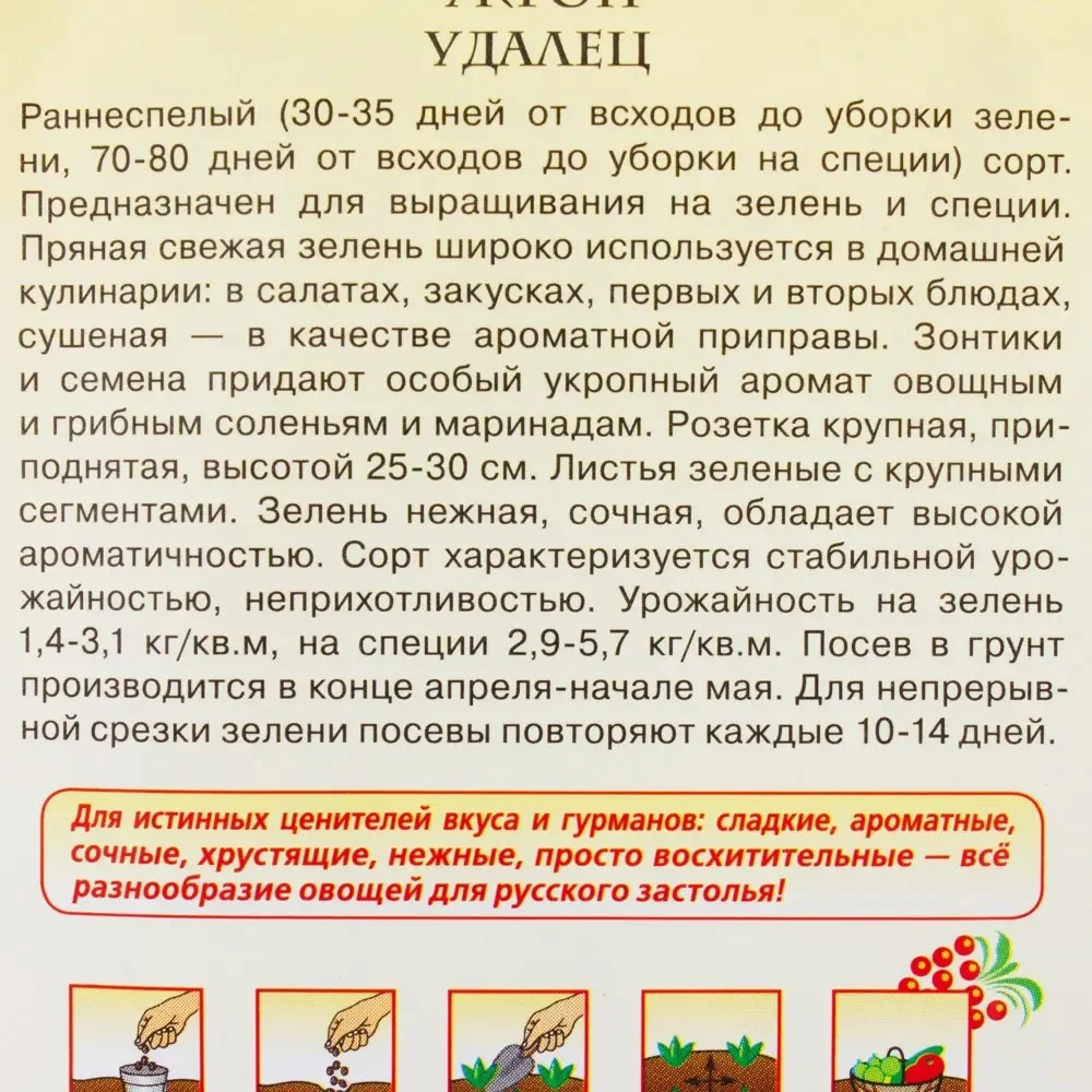 Раннеспелый (30-35 дней от всходов до уборки зелени, 70-80 дней от всходов до уборки на специи) сорт. Предназначен для выращивания на зелень и специи. Пряная свежая зелень широко используется в домашней кулинарии: в салатах, закусках, первых и вторых блюдах, сушеная — в качестве ароматной приправы. Зонтики и семена придают особый укропный аромат овощным и грибным соленьям и маринадам. Розетка крупная, приподнятая, высотой 25-30 см. Листья зеленые с крупными сегментами. Зелень нежная, сочная, обладает высокой ароматичностью. Сорт характеризуется стабильной урожайностью, неприхотливостью. Урожайность на зелень 1,4-3,1 кг/м2, на специи 2,9-5,7 кг/м2. Посев в грунт производится в конце апреля – начале мая. Для непрерывной срезки зелени посевы повторяют каждые 10-14 дней.