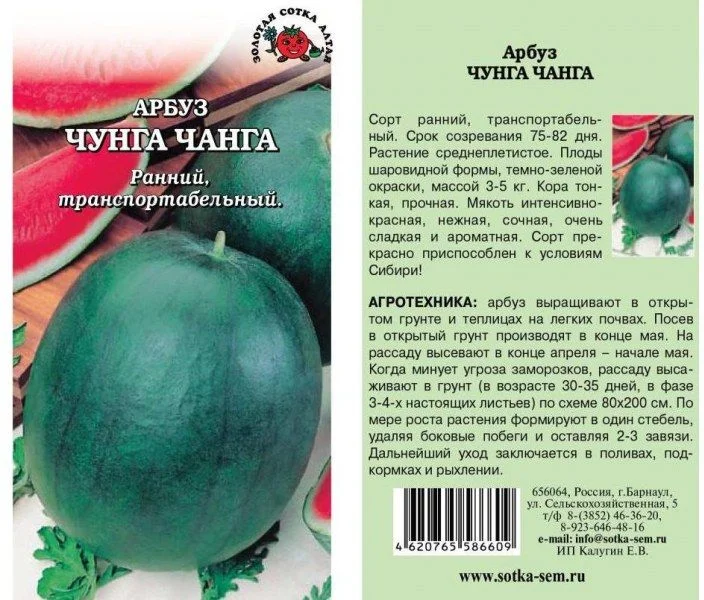 Сорт ранний (75-82 дня), транспортабельный. Растение среднеплетистое. Плоды шаровидной формы, темно-зеленые, массой 3-5 кг. Кора тонкая, прочная. Мякоть интенсивно-красная, нежная, сочная, очень сладкая и ароматная. Сорт прекрасно приспособлен к условиям Сибири! Арбуз выращивают в открытом грунте и теплицах на легких почвах. Посев в открытый грунт производят в конце мая. Посев на рассаду - в конце апреля начале мая. Когда минует угроза заморозков, рассаду высаживают в грунт (в возрасте 30-35 дней, в фазе 3-4-х настоящих листьев) по схеме 80х200 см. По мере роста растения формируют в один стебель, удаляя боковые побеги, и оставляя 2-3 завязи. Дальнейший уход заключается в поливах, подкормках и рыхлении.