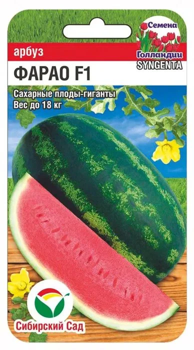 Сахарные плоды-гиганты, вес до 18 кг.Раннеспелый гибрид  с  особо крупными плодами продолговатой формы.  Отличается   презентабельным аппетитным видом и отменным сахарным вкусом плодов.Растение мощное, с крупными листьями, защищающими плоды от перегрева. Арбузы овально-продолговатые, зеленые  с  темными полосами, массой до 15-18кг. Мякоть ярко-красная без волокон, искрящаяся,  с высоким содержанием сахаров.