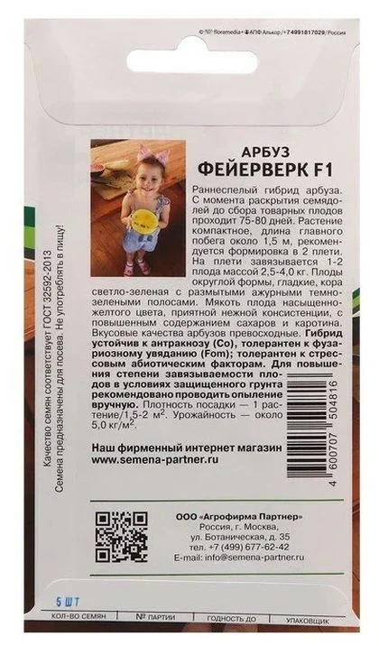 Раннеспелый гибрид арбуза.С момента раскрытия семядолей до сбора товарных плодов проходит 75-80 дней. Растение компактное, длина главного побега около 1,5 м, рекомендуется формировка в 2 плети. На плети завязывается 1-2 плода массой 2,5-4 кг. Плоды  округлой формы, гладкие, кора светло-зеленая с размытыми ажурными темно-зелеными полосами. Мякоть плода насыщенно-желтого цвета, приятной нежной консистенции, с повышенным содержанием сахаров и каротина. Вкусовые качества арбузов превосходные. Гибрид устойчив к антракнозу (Co), толерантен к фузариозному увяданию (Fom); толерантен к стрессовым абиотическим факторам. Для повышения степени завязываемости плодов в условиях защищенного грунта рекомендовано проводить опыление вручную. Плотность посадки — 1 растение/1,5-2 м2.Урожайность — около 5,0 кг/м2.