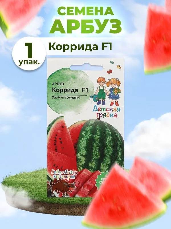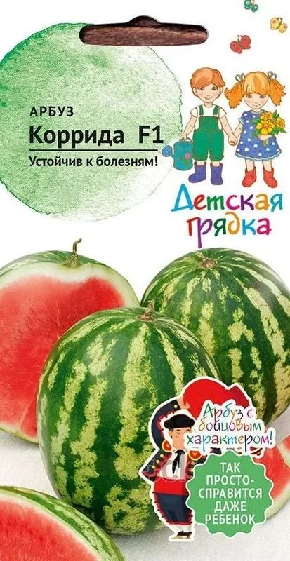 Среднеспелый диплоидный гибрид. 72-75 дней от всходов до начала плодоношения. Растение динноплетистое, хорошо облиственное. Плоды однородные, округлые, массой 8-10 кг, с традиционным «арбузным» рисунком. Мякоть сочная, темно-красная, с высоким содержанием ликопина и сахаров 11,7-12,5%. Вкусовые качества высокие. Кора глянцевая, средней толщины, прочная, устойчива к повреждениям. Гибрид устойчив к фузариозу и антракнозу. Особенность гибрида Коррида F1 – хорошо адаптация к выращиванию в самых различных условиях и типах почв. Агротехника: Арбуз – теплолюбивая культура, предпочитает легкие воздухо- и водопроницаемые почвы. Выращивают через рассаду, а в южных регионах прямым посевом в грунт. Семена в открытый грунт высевают в конце мая, когда почва прогреется до 15 градусов, на глубину 8-10 см. Лунку прикрывают стеклом или пленкой. Рассаду в возрасте 30-35 дней (посев в конце апреля) высаживают на постоянное место в конце мая. Схема посадки 140×100 см. Выращивают на шпалере или в расстил. Растение формируют в 1 стебель, оставляя 2-3 завязи. Уход заключается в своевременных прополках, подкормках и умеренном поливе.