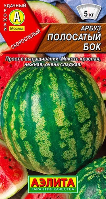 Скороспелый сорт. Первые плоды снимают спустя 75-85 дней от полных всходов. Растения плетистые, главная плеть средней длины. Плоды округлые, выровненные, массой 3-5 кг (в южных регионах при хорошей агротехнике могут вырастать до 10 кг).Сладкая, сочная, ароматная красная мякоть отлично утоляет жажду. Кора тонкая, семена мелкие.После съема плоды можно хранить (без потери вкуса и аромата) до 30 дней.Сорт устойчив к основным болезням культуры – антракнозу и фузариозному увяданию.В средней полосе и северных регионах рекомендуется для выращивания в теплице. Растения подвязывают к шпалере и формируют в один стебель. Все боковые побеги до высоты 50 см удаляют, последующие – прищипывают после третьего листа. В открытом грунте на растении оставляют первые 2-3 завязи и прищипывают точку роста.