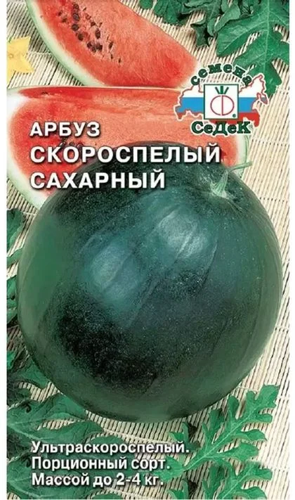 Ультраскороспелый (65-75 дней) сорт для выращивания в открытом и защищенном грунте. Растение короткоплетистое, длина плети до 1,7 м. Плоды округлые, темно-зеленые, массой 2-4 кг, с тонкой корой (толщина 5-6 мм), малосемянные, с густо-красной, очень сладкой мякотью. Урожайность с растения 6-12 кг. Ценность сорта: устойчивость к антракнозу и мучнистой росе, высокие вкусовые и товарные качества плодов, отличная транспортабельность. Являясь кладовой сахаров, витаминов, минеральных солей и органических кислот, арбуз улучшит работу сердца, печени, почек, повысит жизненный тонус организма. Рекомендуется для употребления в свежем виде, для приготовления цукатов и арбузного мёда.