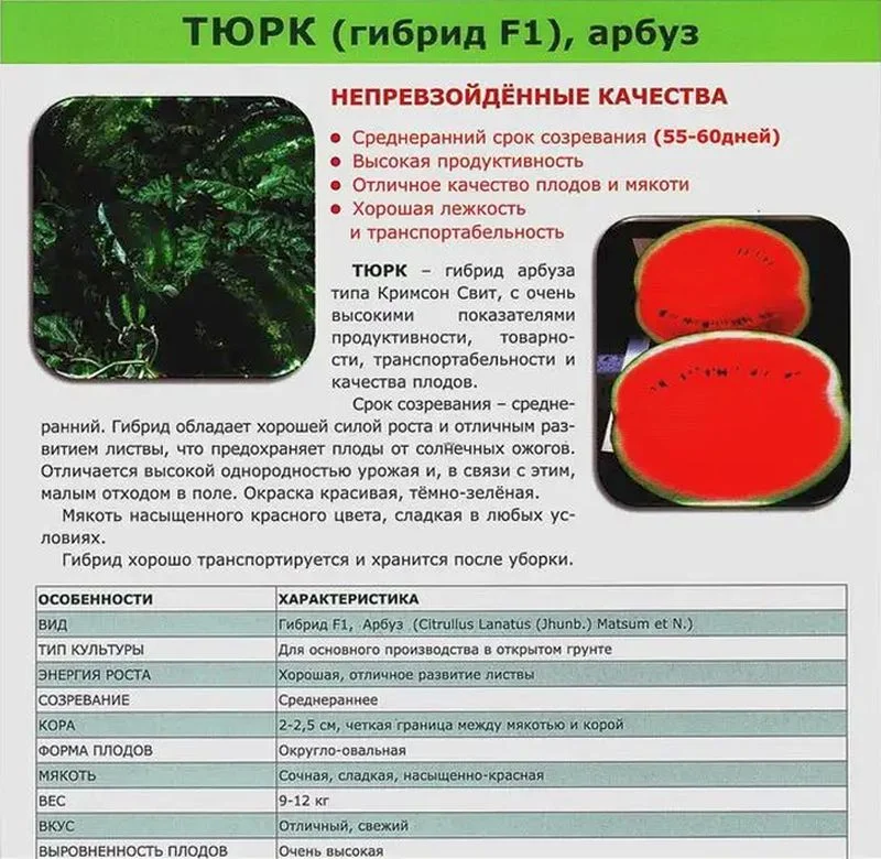 Новый среднеранний (66-87 дн.) гибрид арбуза, тип Кримсон Свит. Предназначен для выращивания в открытом грунте. Растение обладает хорошей силой роста и отличным развитием листвы, что предохраняет плоды от солнечных ожогов. Средняя масса 9-12 кг. Растение плетистое. Главная плеть длинная. Листовая пластинка среднего размера, зелёная, сильнорассечённая, морщинистая. Плод округло-овальный, фон светло-зелёный. Полосы размытые, тёмно-зелёные, средней ширины. Кора тонкая. Мякоть красная, средней плотности. Вкус отличный. Семена мелкие, коричневые, с рисунком в виде точек и пятен