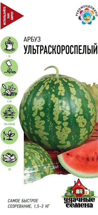 Ультраскороспелый популярный сорт, прекрасно плодоносящий даже в северных регионах России. Плоды округлые, тёмно-зелёные, с едва заметными тёмными полосами, массой 2,5-4,5 кг. Мякоть зернистая, красно-малиновая, очень сладкая и сочная, с мелкими семенами. Ценность сорта: устойчивость к антракнозу и к мучнистой росе, неприхотливость выращивания. Назначение универсальное. Агротехника: Посев на рассаду в начале мая. Высадка рассады в открытый грунт в конце мая - начале июня, в фазе 3-4-х настоящих листьев. Схема посадки 100x100 см. В южных регионах можно выращивать путем прямого посева в грунт в апреле-мае. При выращивании под пленочными укрытиями растения формируют в один стебель (удаляют все боковые побеги до высоты 50 см, последующие прищипывают над 1 -3 листом), подвязывают к шпалере. Для хорошего роста и обильного плодоношения растениям необходим своевременный полив, регулярная прополка, рыхление и подкормка минеральными удобрениями.