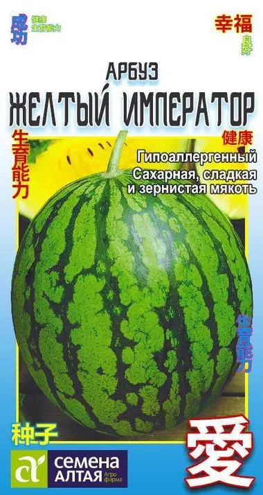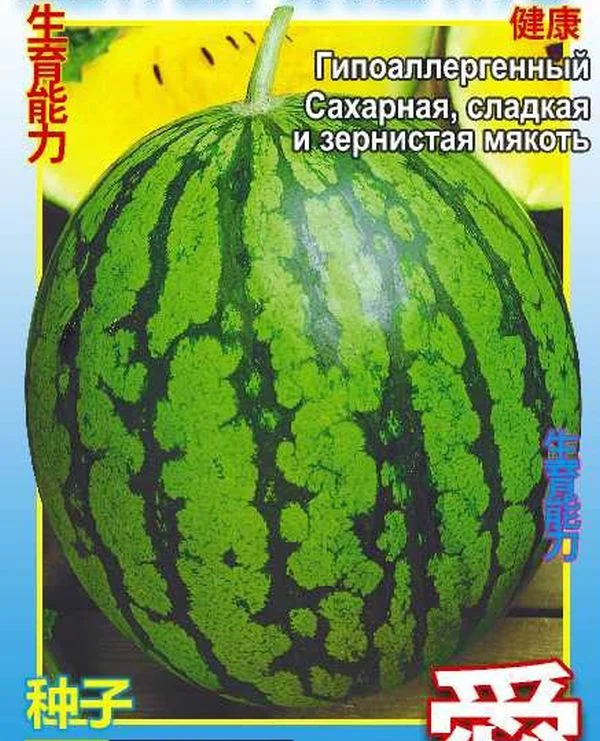 Скороспелый (70-85 дней) сорт для открытого и защищенного грунта. Растения плетистые, устойчивы к пониженным температурам. Плоды светло-зеленые, с рисунком — пятнистые темно-зеленые полосы, овально-цилиндрической формы, массой 2-4 кг, многие вырастают до 5 кг. Мякоть оранжево-жёлтая, зернистая, сладкая, ароматная, очень сочная, с небольшим количеством семян. Отличительной чертой является гипоаллергенность, сорт прекрасно подойдет людям с аллергией на красное. Плоды являются высоко транспортабельными, хранение в спелом виде достигает 3 недель. Свето- и теплолюбивое растение. Предпочитает песчаные, хорошо аэрированные почвы и не выносит переувлажнения. Участок должен быть защищён от ветров. Для увеличения потенциала урожайности и повышения качества плодов, не следует выращивать арбуз на одном месте более двух лет подряд, оптимально – возвращать его на прежнее место через три года. Лучшие предшественники — корнеплоды, лук, капуста. Посев производят, когда почва прогреется до 15°С на глубину 8-10 см. Перед посевом семена обрабатывают в растворе марганцовокислого калия, затем промывают чистой водой. Глубина заделки семян 1,5-2 см. При выращивании рассадным способом, для получения дружных и равномерных всходов, до появления семядолей температура воздуха должна составлять 23–27°C. Перед высадкой рассады в открытый грунт, необходимо провести ее закаливание. Рассаду высаживают, когда минует угроза заморозков, в фазе 3-4 настоящих листьев, соблюдая посадочный интервал 140х100 см в открытом грунте, в теплицах —70х70 см с использованием шпалер. Наиболее интенсивный полив следует обеспечить в период цветения и образования плодов.
