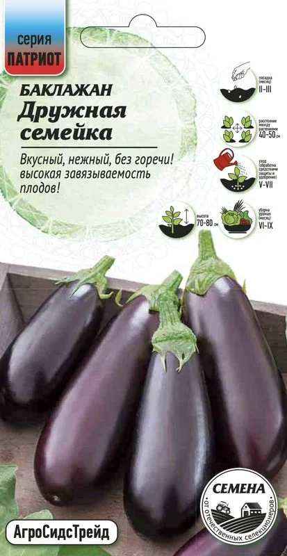 4 кг с одного куста. При этом растение низкорослое, при соблюдении агротехники достигает высоты 90-100 см. Плоды крупные, вырастают до 350-370 г, имеют цилиндрическую форму и тёмно-фиолетовый окрас. Мякоть — чистый снег — белая, нежная, без какого-либо намека на горечь... Вот основная причина, почему блюда из этих «синеньких» превосходны по качеству. Дружная семейка — то, что нужно для вашей дружной семьи!