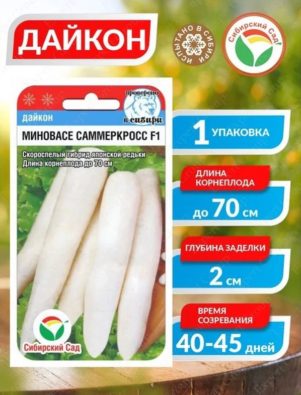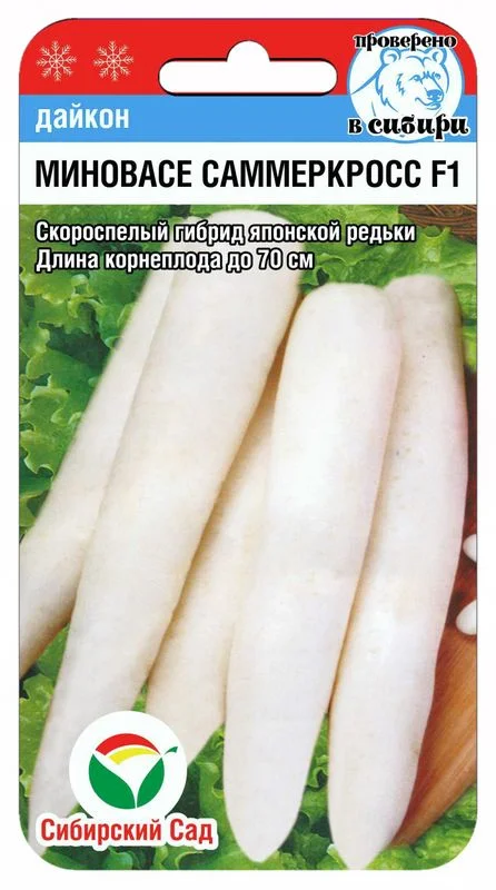 Скороспелый гибрид японской редьки.Корнеплоды белые, цилиндрические, гладкие, сочные и нежные.Длина корнеплодов может достигать 70 см.Дайкон используют в свежем,вареном и соленом виде, прекрасно хранят до весны.