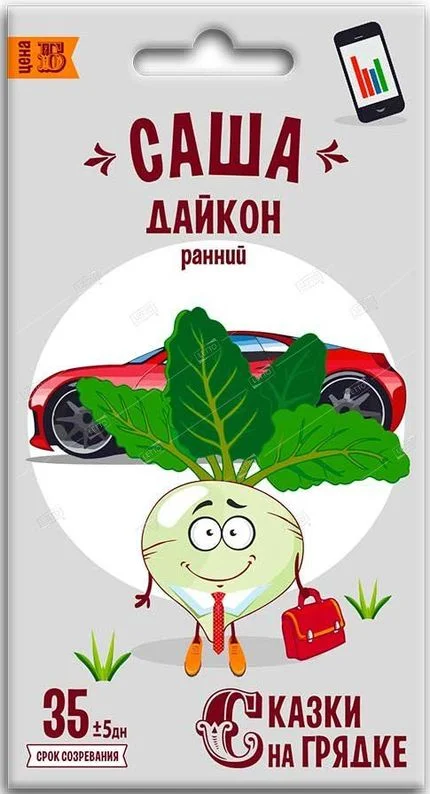 Бизнесмен Саша - обладатель красного чемоданчика и такой же красной машины -отличный специалист. Еще немного - и его успех приведет его к заветному списку Форбс. У него острое чувство юмора, крепкая профессиональная хватка и очень нежная душа. Но, как и многие успешные люди, он редко гуляет пешком. Потому Саша такой пухленький и важный. И наш скороспелый дайкон Саша такой же округлый, сладкий, но с легкой остринкой. Плод нежный, хрустящий и очень сочный! А если подобрать для дайкона Саши легкую и плодородную почву, урожай будет расти, как доход бизнесмена Саши! Сорт дайкона Саша создан Всероссийским НИИ селекции и семеноводства овощных культур. Своё название он получил в честь заслуженного селекционера Александра Степановича Агапова. У этого раннеспелого сорта корнеплод весом от 200 до 400 грамм имеет круглую или продолговатую форму. Как правило, половина его длины расположена под поверхностью почвы. Благодаря тупому кончику, его просто извлекать из почвы и, в отличие от сортов с длинными корнеплодами, эту работу легко выполнять даже без помощи вил. При этом мякоть у корнеплода упругая, сочная и нежная. Достоинства сорта Саша: - хорошая резистентность к преждевременному стеблеванию и слизистому бактериозу; - повышенная холодостойкость; - скороспелость; - семена сохраняют жизнеспособность до 8 лет; - равномерная отдача урожая; - великолепный вкус корнеплодов; - подходит для выращивания в любых регионах нашей страны. Единственным минусом сорта является слабая лёжкость. После уборки корнеплоды желательно употребить в течение месяца, иначе они утратят сочность. Зато благодаря небольшому размеру, их удобно использовать в салатах и других блюдах. Сроки посадки. Сорт относится к супер скороспелым и формирует товарный корнеплод за 35-45 суток от момента полных всходов. Поэтому в средней полосе России его сеют семенами в открытый грунт вплоть до 10 августа. Нестабильный температурный режим вызывает утолщение корнеплода в его нижней части. В результате он приобретает грушевидную форму, а мякоть сильно грубеет. Существует два срока посева культуры — ранневесенний и летний. При этом именно июльский сев даёт лучшую урожайность. Происходит это оттого, что дайкон реагирует на длинный световой день образованием цветоносов, а не урожая. Кроме того, в мае начинается лет крестоцветной блошки и капустной мухи, которые с удовольствием поедают нежные листочки всех растений семейства крестоцветные. Вторая часть лета максимально благоприятна для дайкона по климатическим условиям. К середине июля продолжительность светового дня сокращается и солнце уже не так агрессивно. Посадка. Так как дайкон Саша даёт миниатюрные корнеплоды, его обычно выращивают по схеме 20-30 х 15-20 сантиметров. Глубина заделки семян — 2 — 4 сантиметра. Ради удобства ухода рекомендую делать ширину грядки не более одного метра. Несмотря на то что у сорта короткий корнеплод, его лучше выращивать на участках с толстым пахотным слоем и высокоплодородной почвой. В местах с поверхностным расположением грунтовых вод овощ удобнее размещать на приподнятых грядах. При этом при закладке такой грядки нельзя использовать молодой навоз или большие дозы перегноя. Дайкон хорошо высевать после бобовых растений (гороха, фасоли), зелени, лука и летних сидератов. А поскольку в первую неделю после вс