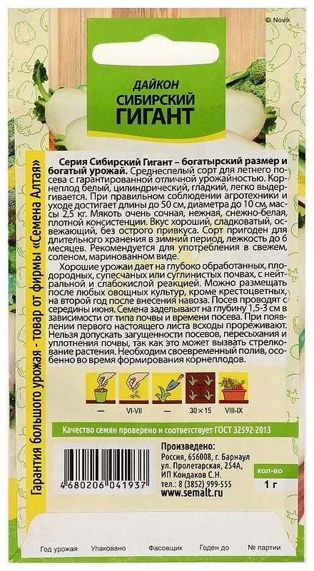 Среднеспелый сорт для летнего посева с гарантированной отличной урожайностью. Корнеплод белый, цилиндрический, гладкий, легко выдергивается. При правильном соблюдении агротехники и уходе достигает длины до 50 см, диаметра до 10 см,массы 2,5 кг. Мякоть очень сочная, нежная, снежно-белая, плотной консистенции. Вкус хороший, сладковатый, освежающий, без острого привкуса. Сорт пригоден для длительного хранения в зимний период, лежкость до 6 месяцев. Рекомендуется для употребления в свежем, соленом, маринованном виде.