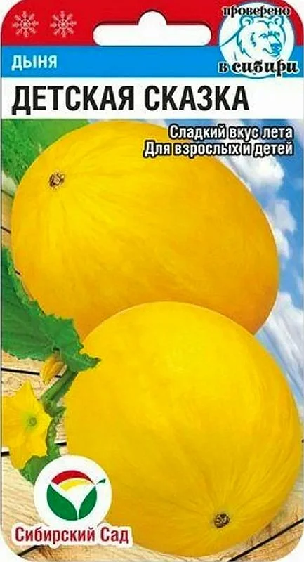 Сладкий  вкус  лета, для  взрослых  и детей. Раннеспелый сорт, отличающийся сладким вкусом  сочной  дынной мякоти,   хорошей  урожайностью и дружным созреванием плодов  в  умеренном климате.Растение среднеплетистое. Плоды овальные,  гладкие, желтые с  редкой сеточкой,  порционные,  массой до 2кг. Мякоть светлая, толщиной 2-3см, сочная, сладкая.