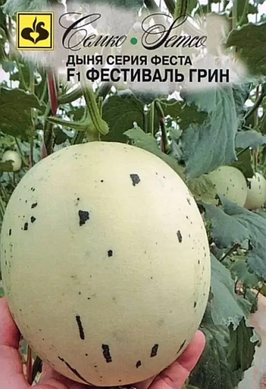 Дыня Фестиваль Грин F1 - среднеспелый гибрид сортотипа Феста для открытого и защищенного грунта. От высадки 25-дневной рассады до первого сбора плодов 70-75 дней, или 45-50 дней от момента опыления. Растение среднеплетистое, мощное, лист небольшой, зелёный, на одной плети 1-2 дыни. Плоды округло-овальные, гладкие, без сетки, с чётко выраженными тёмно-зелёными пятнами на светло-зелёной коре, массой 1,6-1,8 кг. Мякоть светло-зелёная, нежная, сочная, ароматичность средняя, вкус отличный. Гибрид дыни Фестиваль Грин F1 устойчив к фузариозу (Fom) и мучнистой росе (Px). Кора плотная. Рекомендуется для выращивания в теплицах с расстоянием между растениями 40 см с подвязкой к опоре. Растение формируют в один стебель, удаляя все пасынки до боковой плети с женским цветком (11-12 лист), которую прищипывают, оставляя 2-3 листа после цветка. После этой боковой плети с завязью, главный стебель прищипывают над 26 листом или на уровне шпалеры, удаляя все пасынки, и оставляя 1-2 боковых побега у верхушки (полная схема формировки на сайте semco.ru). Урожайность 3,2-3,6 кг/м2 .