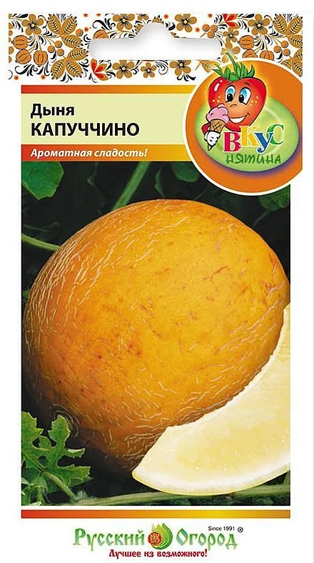 Дыня Капуччино – потрясающий и всеми любимый сорт, который пользуется популярностью уже многие годы! Этот десертный сорт дыни обладает нежным вкусом, имеет приятный аромат, сочную и сладкую мякоть. Полезные свойства и низкая калорийность позволяют использовать дыню в свежем виде для приготовления различных десертов. Сорт дыни Капуччино имеет тонкую кремовую кожуру, под которой находится белоснежная нежно-сладкая мякоть. Содержание сахара в плодах этого сорта 17 %, благодаря чему дыня имеет безупречный вкус. Плоды имеют аккуратную форму, по весу не превышают 1 килограмма. Сорт Капуччино также ценится ранним и высоким урожаем!