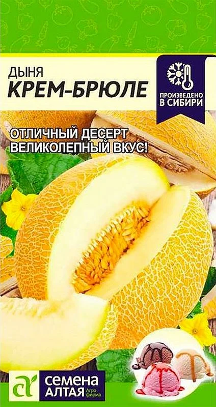 Прохладная мякоть тает во рту! Сорт среднеспелый, урожайный и транспортабельный. Растение длинноплетистое. Дыньки одна к одной – овальные, гладкие, желто-оранжевые, массой 1,3-1,8 кг. Мякоть кремовая, сладкая, очень ароматная. Сорт простой в агротехнике. Посев производят, когда почва прогреется на глубину 8-10 см до 15ºС. Перед посевом семена обрабатывают в растворе марганцовокислого калия, затем промывают чистой водой. В случае рассадного способа выращивания рассаду высаживают, когда минует угроза заморозков, в возрасте 3-4 настоящих листьев. В открытом грунте дыню высаживают по схеме 140х100 см, в теплицах — 70х70 см с использованием шпалер. На приусадебных участках возможно выращивание дыни путем её прививки на тыкву. Наиболее распространенный способ прививки — в расщеп. Привитые на тыкву дыни более холодостойкие.