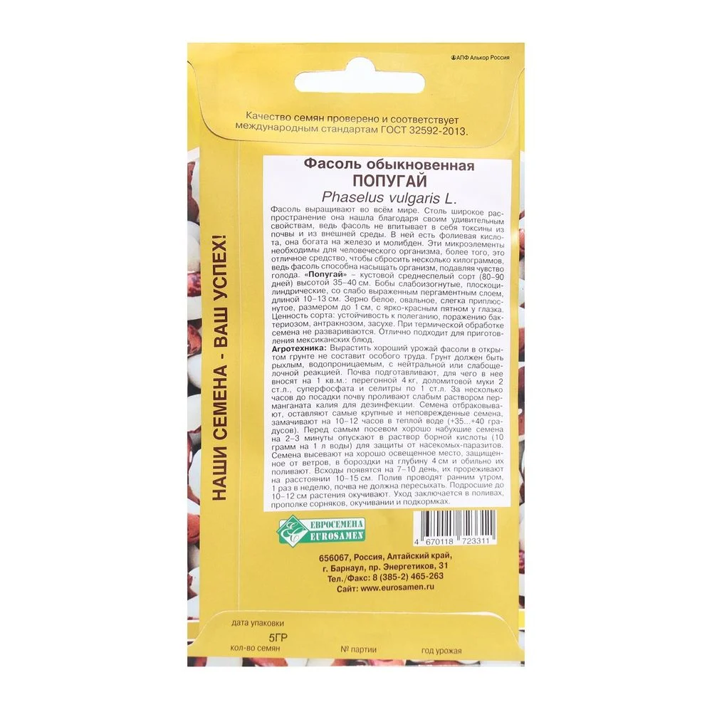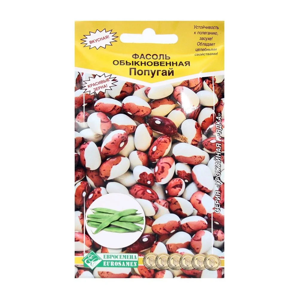 Фасоль выращивают во всём мире. Столь широкое распространение она нашла благодаря своим удивительным свойствам, ведь фасоль не впитывает в себя токсины из почвы и из внешней среды. В ней есть фолиевая кислота, она богата на железо и молибден. Эти микроэлементы необходимы для человеческого организма, более того, это отличное средство, чтобы сбросить несколько килограммов, ведь фасоль способна насыщать организм, подавляя чувство голода. »Попугай» - кустовой среднеспелый сорт (80-90 дней) высотой 35-40 см.