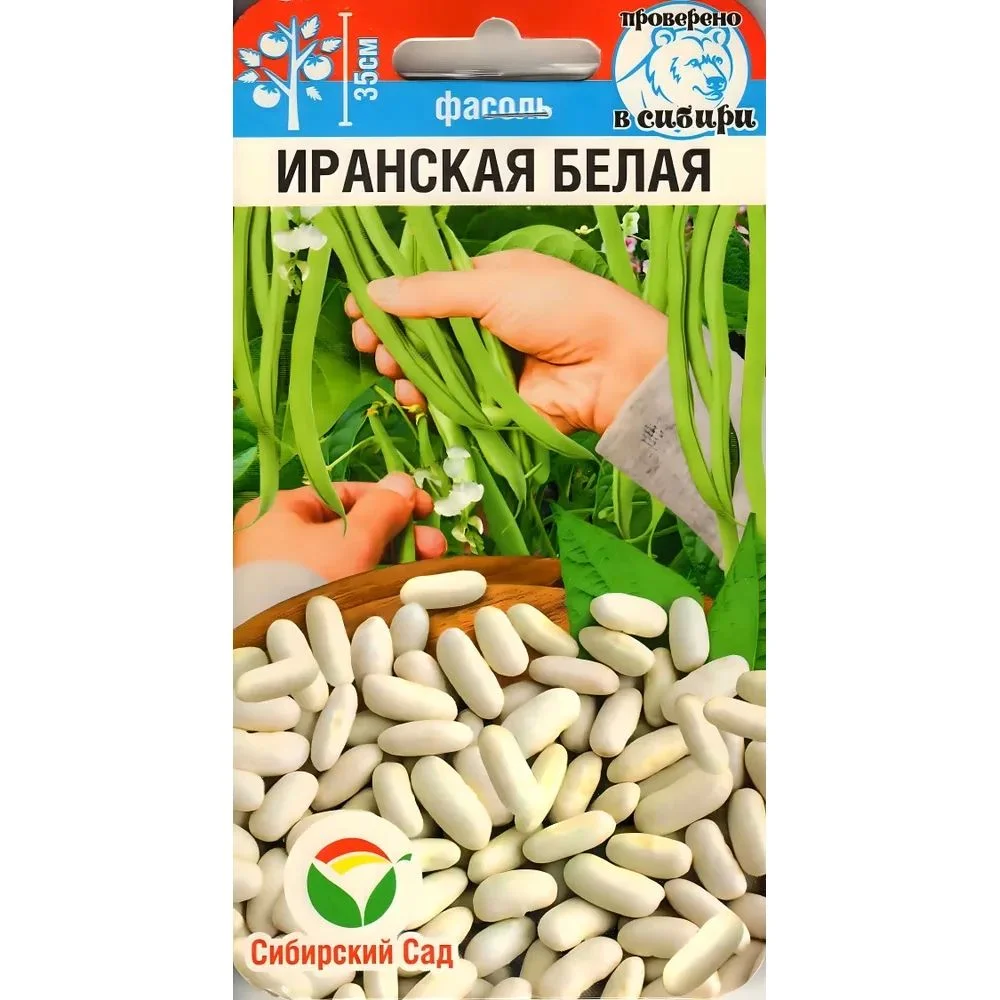 Фасоль Иранская Белая. Среднеранний сорт (55-65 дней) спаржевой фасоли, устойчивый к болезням культуры. Отличается длительным периодом сбора урожая и высокой продуктивностью. Растения кустовые, компактные, высота 30-35 см. Бобы белые, длиной 9-12 см, не содержат грубых волокон. Сорт подходит для домашней кулинарии и замораживания. Молодые бобы употребляются в пищу целиком. Сбор урожая проводят несколько раз по мере созревания бобов.