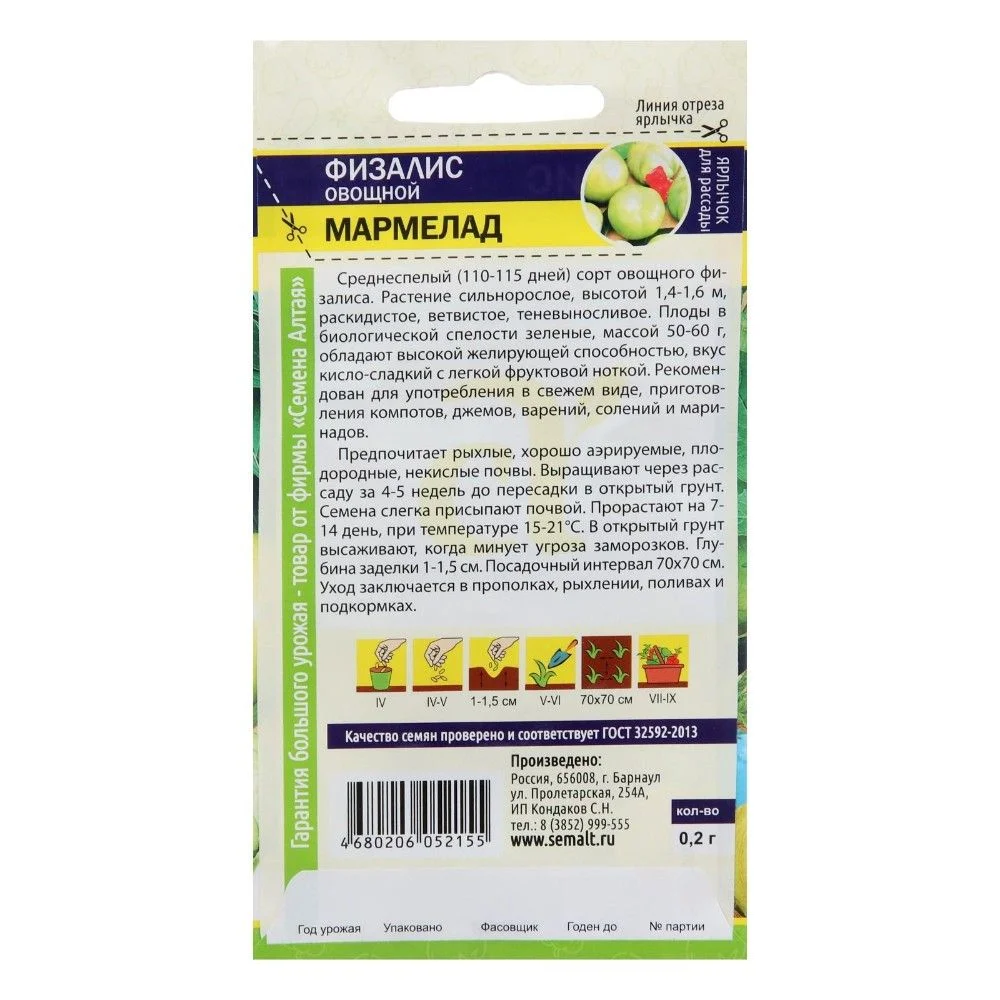 Среднеспелый (110-115 дней) сорт овощного физалиса.Растение сильнорослое, высотой 1,4-1,6 м, раскидистое, ветвистое, теневыносливое. Плоды в биологической спелости зеленые, массой 50-60 г, обладают высокой желирующей способностью, вкус кисло-сладкий с легкой фруктовой ноткой. Рекомендован для употребления в свежем виде, приготовления компотов, джемов, варений, солений и маринадов. Предпочитает рыхлые, хорошо аэрируемые, плодородные, некислые почвы. Выращивают через рассаду за 4-5 недель до пересадки в открытый грунт. Семена слегка присыпают почвой. Прорастают на 7-14 день, при температуре 15-21 °С. В открытый грунт высаживают, когда минует угроза заморозков. Глубина заделки 1-1,5 см. Посадочный интервал 70х70 см. Уход заключается в прополках, рыхлении, поливах и подкормках.