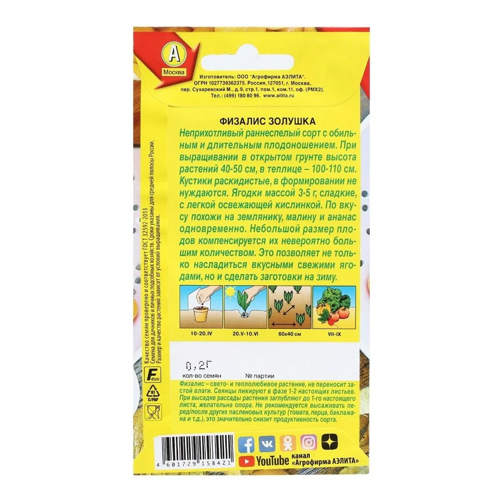 Неприхотливый раннеспелый сорт с обильным и длительным плодоношением. При выращивании в открытом грунте высота растений 40-50 см, в теплице – 100-110 см. Кустики раскидистые, в формировании не нуждаются.Ягодки массой 3-5 г, сладкие, с легкой освежающей кислинкой. По вкусу похожи на землянику, малину и ананас одновременно. Небольшой размер плодов компенсируется их невероятно большим количеством. Это позволяет не только насладиться вкусными свежими ягодами, но и сделать заготовки на зиму. Физалис – свето- и теплолюбивое растение, не переносит застой влаги. Сеянцы пикируют в фазе 1-2 настоящих листьев. При высадке рассады растения заглубляют до 1-го настоящего листа, желательна опора. Не рекомендуется высаживать перед/после других пасленовых культур (томата, перца, баклажана и т.д.), это значительно снизит продуктивность сорта.