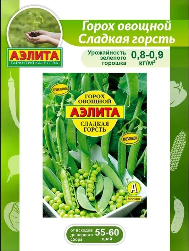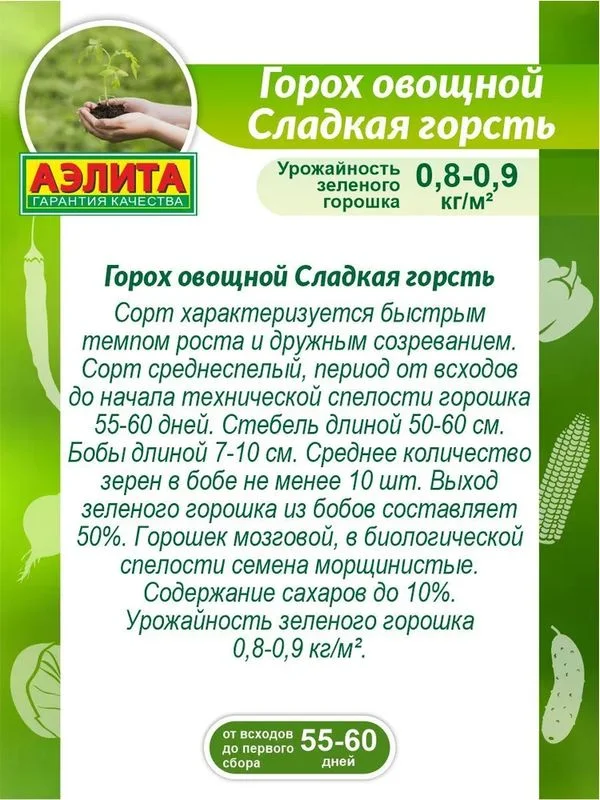 Лущильный сорт. Характеризуется быстрым темпом роста и дружным созреванием. Сорт среднеспелый, период от всходов до начала технической спелости горошка 55- 60 дней. Стебель длиной 50-60 см. Бобы длиной 7-10 см. Среднее количество зерен в бобе не менее 10 шт. Выход зеленого горошка из бобов составляет 50%. Горошек мозговой, в биологической спелости семена морщинистые. Содержание сахаров до 10%. Вкус в свежем, консервированном и замороженном виде отличный. Урожайность зеленого горошка 0,8- 0,9 кг/м 2 . Сорт высокопластичный, обеспечивает стабильный урожай в любом регионе. Вынослив к переувлажнению почвы.Посев. Перед посевом семена замачивают в воде до набухания. Высевают семена в открытый грунт на глубину 4-6 см. Собирают урожай по мере созревания. Растениям необходимы своевременные поливы, прополки, рыхления.
