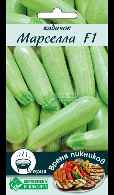 Овощи на гриле, а также овощной шашлык — здоровая альтернатива блюдам из жареных продуктов, их можно подать в качестве закуски или гарнира, из них получается прекрасный салат — теплый или холодный. К тому же запекать овощи можно и дома, и на природе. Овощная серия «Время Пикников» разработана специально для осуществления этих целей и включает сорта и гибриды овощей с малым количеством влаги и семечек. Их легко и быстро можно приготовить, предварительно замариновав их или приправив уже готовые овощи сыром, различными соусами, зеленью или маринадом с ароматными специями. К таким овощам хорошо подать кусочки хлеба, поджаренного на гриле. Приготовление занимает считанные минуты, а удовольствия на целый день! Кабачок «Марселла F1»- раннеспелый гибрид кабачка с плодами цилиндрической формы, без ребристости, глянцевые, светло-зеленого цвета, длиной 16-18 см, массой 300-400 грамм.