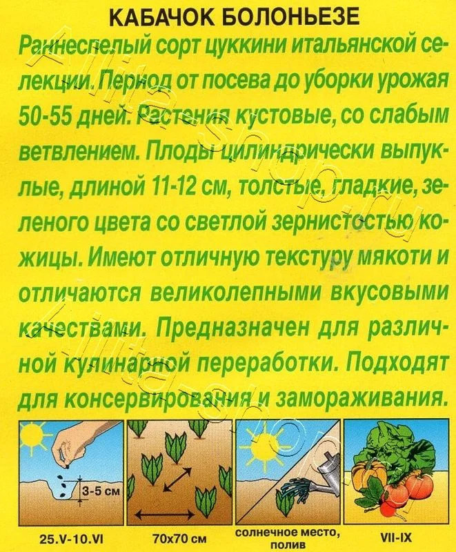 Раннеспелый сорт цуккини итальянской селекции. Период от посева до уборки урожая 50-55 дней. Растения кустовые, со слабым ветвлением. Плоды цилиндрически выпуклые, длиной 11-12 см, толстые, гладкие, зеленого цвета со светлой зернистостью кожицы. Имеют отличную текстуру мякоти и отличаются великолепными вкусовыми качествами. Предназначен для различной кулинарной переработки. Подходят для консервирования и замораживания.