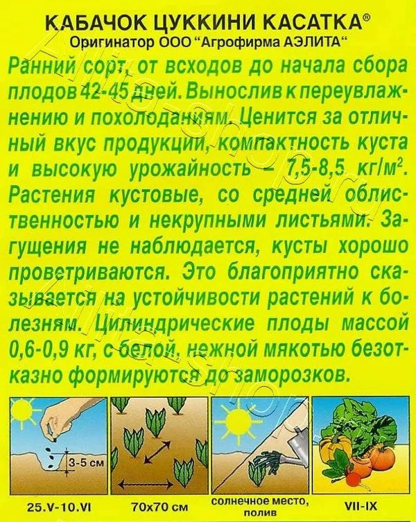 Новый, высокоурожайный раннеспелый сорт, период от всходов до начала сбора плодов 42-45 дней. Растения полуплетистые. Урожайность 7-8 кг/м 2 . Плоды цилиндрические, ребристые, средней длины и среднего размера, массой 0,6-0,9 кг. Мякоть белая, плотная, сочная и нежная. Вкусовые качества отличные. Рекомендуется для домашней кулинарии. Плоды хорошо хранятся и транспортируются. Сорт отличается выносливостью к переувлажнению и пониженным температурам. Посев семян в открытый грунт по 2-3 шт. в лунку. В фазе первого настоящего листа всходы прореживают, оставляя по одному растению. Возможен рассадный способ выращивания – 20-30-дневную рассаду высаживают в открытый грунт, когда минует угроза заморозков. Растениям необходимы своевременные поливы, прополки, рыхления и подкормки. Для стимуляции плодообразования сбор плодов проводят регулярно.