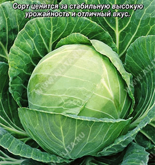 Скороспелый сорт, период вегетации от полных всходов до уборки урожая 105-110 дней. Розетка горизонтальная, лист большой, слабопузырчатый, восковой налет средней интенсивности. Кочан светло-зеленый, округлый, на разрезе беловатый, массой 1-2 кг, плотный (4,2 балла), не склонен к растрескиванию. Наружная и внутренняя кочерыги короткие. Созревание дружное. Товарная урожайность высокая, 4,5-5 кг/м2, на уровне раннеспелых гибридов. Выход товарной продукции 94%. Обладает высокой транспортабельностью по сравнению с другими ранними сортами и гибридами. Среди достоинств сорта необходимо отметить прекрасный вкус свежей продукции.Посев на рассаду в середине марта. Пикировка в фазе семядолей. Высадка рассады в грунт в конце апреля-начале мая (через 45-50 дней, в фазе пяти-шести настоящих листьев) по схеме 50х40 см. Для хорошего роста и плодоношения растениям необходим своевременный полив, регулярная прополка, рыхление и подкормка минеральными удобрениями.    10-20.III  20.IV-10.V  50х40 cм     VI