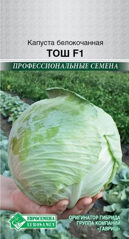 Полезные свойства капусты трудно переоценить.Капуста богата витаминами А, В1, Р, К, В6, U.Она – лидер среди овощей по содержанию витамина С, который сохраняется в капусте как при длительном хранении в сыром виде, так и при термической обработке.Тош - позднеспелый гибрид капусты белокочанной для выращивания в открытом грунте.Период вегетации 100-110 дней.Рекомендуется для хранения до 5 месяцев и всех видов переработки (квашения, засолки, тушения и употребления в свежем виде).Кочаны, массой 2,5-4 кг, округлые, с плотной внутренней структурой и высокими вкусовыми качествами.Листья голубовато-зеленые с восковым налетом.Гибрид генетически устойчив к фузариозному увяданию и сосудистому бактериозу.Отличается хорошей устойчивостью к высоким температурам, отлично сохраняется в полевых условиях.