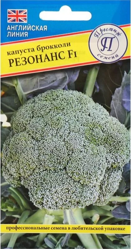Капуста брокколи Резонанс F1 — гибрид новой селекции, среднеспелый, уборка через 75 дней после высадки рассады в середине мая. Отличается мощной корневой системой, практически не образует боковых побегов. Головки диаметром до 20 см, плотные, темно-зеленые, весом чуть более 1 кг, с высокими товарными характеристиками для реализации в свежем виде. Подлежат заморозке. Без потери качества переносят краткосрочное хранение. В марте семена высевают на рассаду и пикируют всходы в возрасте семядольных листочков.