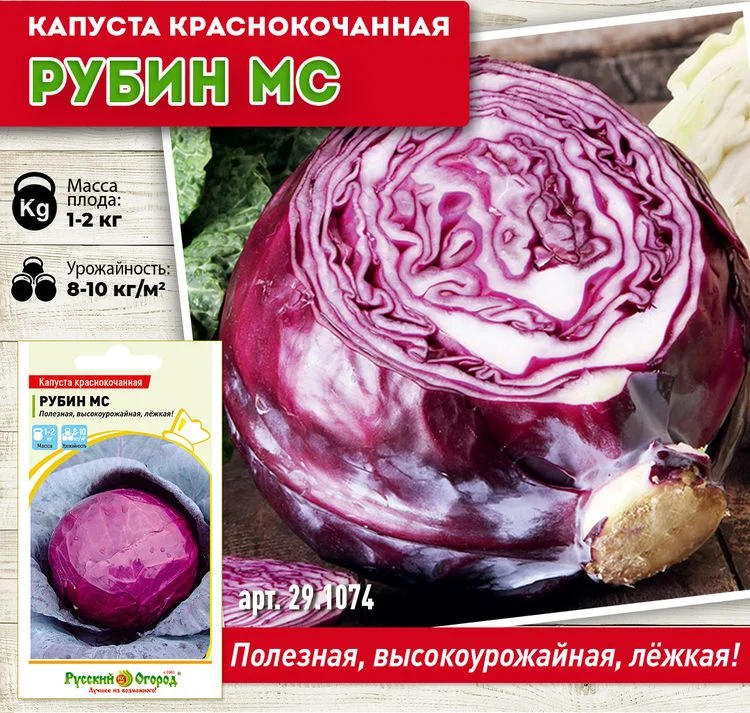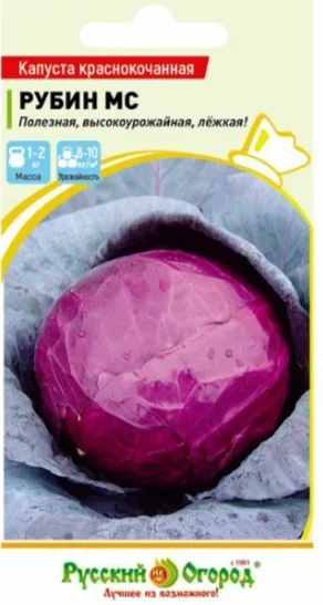 Среднеспелый сорт с технической спелостью через 120-130 дней после высадки рассады. Листья фиолетовые, с восковым налетом, средней величины с волнистым краем. Наружная кочерыга средней высоты. Кочан округло-плоский, рубиново-фиолетовый, плотный, массой 1-2 кг. Не растрескивается. Высокоурожайный, транспортабельный сорт подходит для свежего потребления и переработки. Кочаны отлично хранятся до января. Урожайность до 8-10 кг/м2.