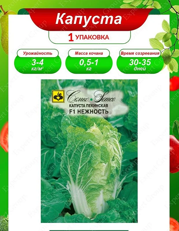Ультраскороспелый гибрид. От высадки 25-дневной рассады до начала уборки 30–35 дней. Растение среднерослое, розетка листьев полупрямостоячая, листья средние, зеленые, широкоэллиптические, среднеглянцевые, пузырчатые, без опушения, жилка вогнутая, широкая. Кочан некрупный закрытый, массой 0,5–1 кг, форма в продольном сечении широкоэллиптическая, на разрезе желтовато-белой окраски, средней плотности. Внутренняя кочерыга средней длины. Вкусовые качества и товарность отличные. Генетически устойчив к киле крестоцветных и толерантен к слизистому бактериозу. Предназначен для потребления в свежем виде и краткосрочного хранения. Рекомендуется для выращивания в открытом и защищенном грунте. Схема высадки рассады 60х30 см. Урожайность 3–4 кг/м2.