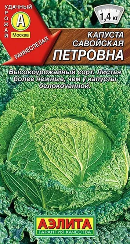 Раннеспелый сорт, от посева до созревания кочанов примерно 110 дней. Кочан округлый, на разрезе желтоватый, средней плотности, массой 1,2-1,4 кг. Наружная кочерыга короткая. Лист пузырчатый, более тонкий и нежный, чем у белокочанной капусты. Используется в свежем виде в салатах и для приготовления солянок, щей, начинок для пирогов. Самые аппетитные голубцы получаются именно при использовании листьев савойской капусты. Она богата витаминами С, В1, РР, каротином, солями калия, магния, кальция, железа, фосфора. Вкус отличный. Урожайность высокая – 4,5-5,2 кг/м2. Посев. Выращивается через рассаду. Очень важно поддерживать температурный режим: днем 15-18°С, ночью 12-14°С. Высаживают рассаду в открытый грунт в возрасте 35-40 дней, в фазе 5-6 настоящих листьев. В течение всего сезона нуждается в регулярных обильных поливах. Растениям необходимы своевременные прополки, рыхления и подкормки. 01-15.IV    01-10.V    50x50 cm     IX-X
