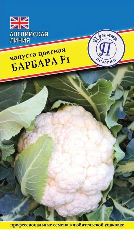 Барбара F1-раннеспелый гибрид цветной капусты (55-60 дней от высадки рассады до уборки урожая). Рекомендуется для выращивания в открытом грунте. Сильнорослое растение. Розетка листьев вертикальная. Листья среднего размера, слабопузырчатые, темно-зеленые со слабым восковым налетом. Прямостоячее расположение листьев способствует дополнительной защите головки от прямых солнечных лучей. Головка плоско-округлая, среднебугристая, снежно-белая, диаметром 17-22 см, массой 0,9-1,5 кг. Внутренняя структура плотная, транспортабельность хорошая. При заморозке белая окраска сохраняется.Гибрид среднеустойчив к фузариозному увяданию.Гибрид Барбара F1 предназначен для реализации на свежем рынке, краткосрочного хранения и заморозки. Сильная корневая система способствует устойчивости к стрессовым факторам.Гибриду присуще одновременное созревание, что позволяет проводить одноразовую уборку.