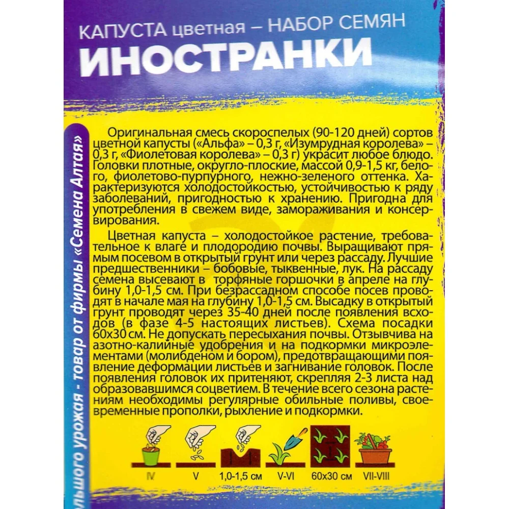 Оригинальная смесь скороспелых (90-120 дней) сортов цветной капусты украсит любое блюдо. Головки плотные, округло-плоские, массой 0,9-1,5 кг., белого, фиолетово-пурпурного, нежно-зеленого оттенка. Характеризуется холодостойкостью, устойчивостью к ряду заболеваний, пригодностью к хранению. Рекомендуется для употребления в свежем виде, замораживания и консервирования. Цветная капуста - холодостойкое растение, требовательное к влаге и плодородию почвы. Выращивают прямым посевом в открытый грунт или через рассаду. Для получения рассады семена начинают высевать в первой декаде марта, а рассаду в открытый грунт с 25 мая по 10 июня. Схема посадки 50х50 см. Капуста отзывчива на азотно-калийные удобрения и на подкормки микроэлементами (молибденом и бором), предотвращающими появление деформации листьев и загнивание головок. После появления головок их притеняют, надламывая над ними 1-2 листа. Сбор урожая проводят по мере формирования головок.